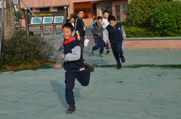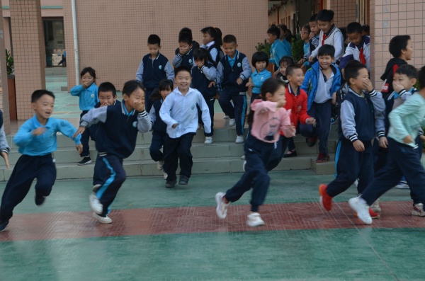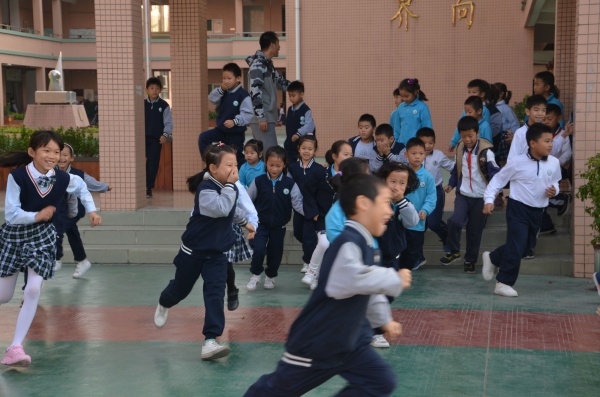 随着警铃的响起,疏散演练拉开了序幕。学校领导、老师迅速组织同学们撤离教室,在全体教师的有序组织下,学生迅速疏散到操场。撤离过程中,同学们时刻保持警觉,弯着腰、压低身体迅速前进,孩子们熟练地利用自己的手或者衣物捂住鼻口,防止烟雾的吸入。楼上的班级和老师一起下楼梯。在老师的引导下,有序地沿左、中、右3个楼梯口疏散。从警报响起到800多名全体师生就位于安全地点,用时2分15秒,疏散演练的效果显著。同学们到达指定疏散地点后,各班立即汇报人数,班级班干部向相关老师报告疏散情况以及到场人数。