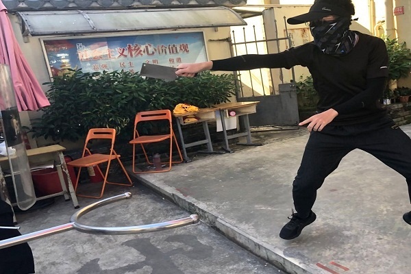 本次模拟场景:清晨,学生上完早读课后,正三三两两地走出课室的时候,一名蒙面的持刀歹徒突然闯进校园。学校立即启动安全预防校园暴力事件应急预案,学校德育处郝利娟主任播放警情通知:“有歹徒闯入校园,同学们快速到安全地方!全体老师快速到班级!” 安全组一名老师打电话报警,在学校附近的巡警火速赶到了现场。学校保安室三名保安人员立即持钢叉和盾牌,老师们则有的持长棍,有的随手抓起板凳、铁锹等工具上前驱赶,在警察的配合下,大家一起将暴徒制服,最后警察将暴徒缉拿带走。