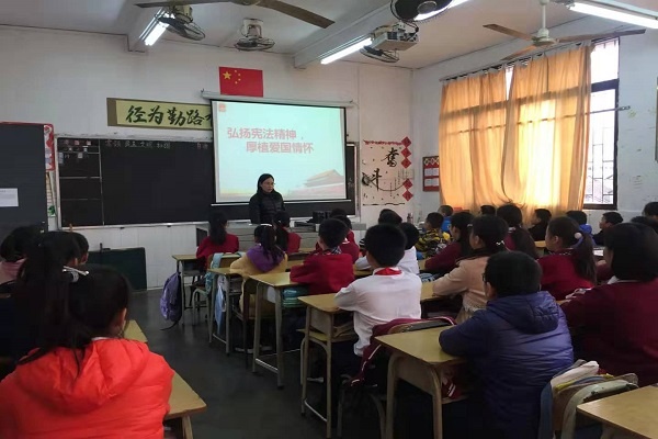 升旗仪式结束之后,各班在班主任的带领下,举行了“宪法晨读活动”。“中华人民共和国是工人阶级领导的、以工农联盟为基础的人民民主专政的社会主义国家......”阵阵读书声从校园里传出来,传到很远的地方去,宪法精神也像这响亮的童声一样响彻校园,影响着更多的人。