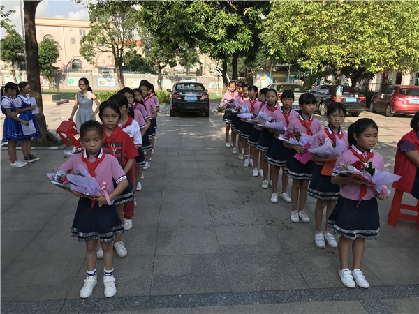 最后是最激动人心的时刻,五年级志愿者们队列整齐的为每一位老师献上了一束鲜花和贺卡,每一枝花中都饱含着学生对老师们表达的节日祝福和深深的敬意。当学生把一张张贺卡和花朵送给老师时,老师们不禁露出了幸福的笑容。