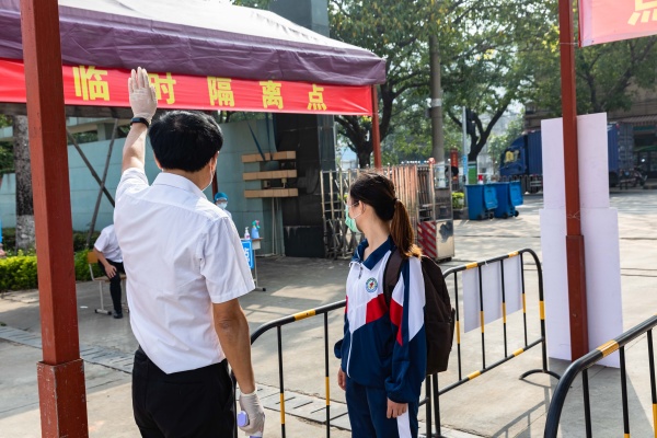 学校大门是校园疫情防控的第一道防线,故演练拍摄首先从学生进入校门开始。校门口拍摄包含了三个场景,一是学生戴口罩,按要求进行排队,由教师测量体温。二是有学生出现体温异常,送至隔离区,由校医进行复检。三是学校老师或外来人员进入学校前进行粤康码的扫描。为了呈现良好效果,需要不断重复,但是,“学生”毫无怨言,只希望能为顺利复学尽自己一份力。