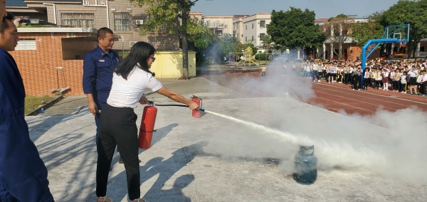 在接下来的总结会上,南头镇消防大队陈队长对今天师生们在演练中的表现给予了充分的肯定,并结合今天演练的情况,就如何报火警、火灾的预防、火场自救及逃生方法、灭火器的使用等消防安全知识进行了讲解,并现场指导师生们学习使用灭火器进行灭火。