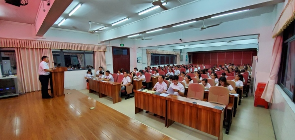 高尚的师德,是对学生最生动、最具体、最深远的教育。为进一步加强师德师风建设,全面提升学校教师思想政治素质和职业道德水平,努力造就一支师德高尚、业务精湛、充满活力的高素质教师队伍,根据《广东省教育厅关于开展2019年师德建设主题教育月活动的通知》要求,结合学校实际,南头华晖学校9月11日晚在六楼会议室举行了“自觉爱国守法,潜心教书育人”师德建设主题教育宣讲活动,全体教职员工参加了本次活动。活动由学校校长助理蒋姣嫔主持。