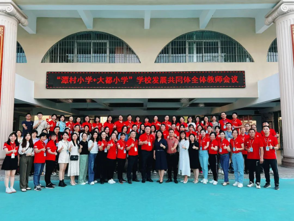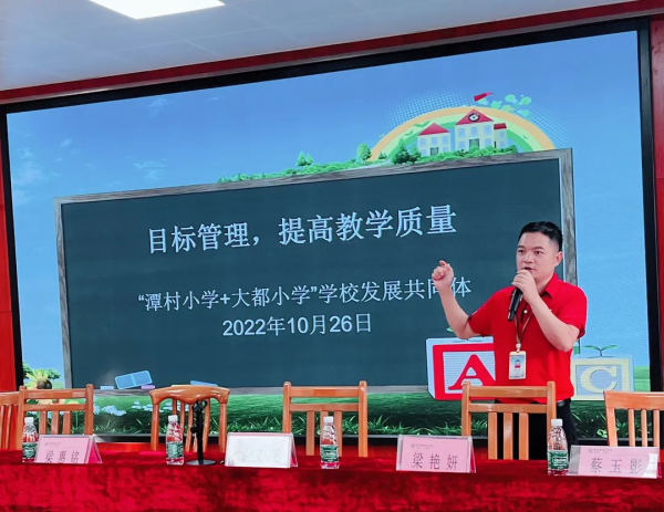 随后,梁惠铭校长对“潭村小学+大都小学”学校发展共同体的成立及前期工作情况作了简要汇报。她指出,“潭村小学+大都小学”学校发展共同体的成立是顺应陈村镇教育高质量发展的时代需求,自去年六月成立以来,共同体各项工作都在有序的推进中,两校间的友好交流在不断地加强与推进中,并已取得了初步的成效。在刚结束的陈村镇中小学生田径运动会上,共同体首次挺进前三名,这是两校发挥有势互补最大效能化的有力体现,两校在运动员的选择、训练事宜的安排等均是共同商量、共同参与。今后,共同体还要继续发挥优势互补、互利互进的团结奋进精神,将潭村小学和大都小学拧成一股坚韧的绳,一起为走向更美好的教育未来而努力奋进。与此同时,她勉励全体教师要努力为共同体的发展贡献智慧,为共同体的发展献出力量。