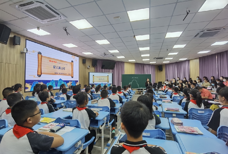 活动的第一项议程,由龙江城区中心小学叶丽燕副校长带来一节五年级的课例展示——《猎人海力布》。叶老师通过设定“民间故事大讲堂”的主题情境,由此推出了“讲好海力布的故事,争当民间故事传承人”的核心任务,聚焦“创造性复述”这一语文要素,进阶式安排了“故事内容我回顾”“创造复述我挑战”“人物形象我来悟”三个语言实践活动,嵌入式进行评价,在课堂中体现“教学评一致性”的理念。