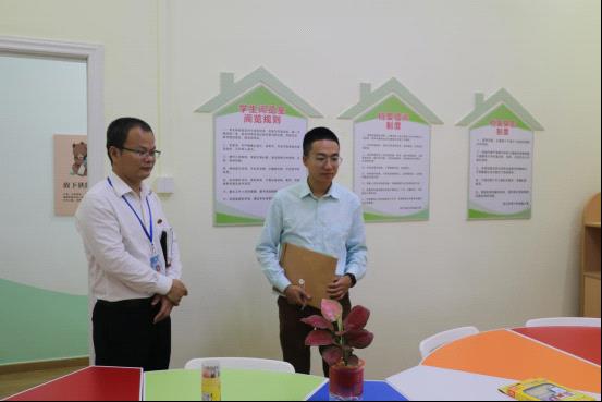区洁如组长饶有兴趣地聆听了李少强校长关于“幸福地创造智雅”的办学理念与“幸福小窝”心理辅导室的文化建设心得。