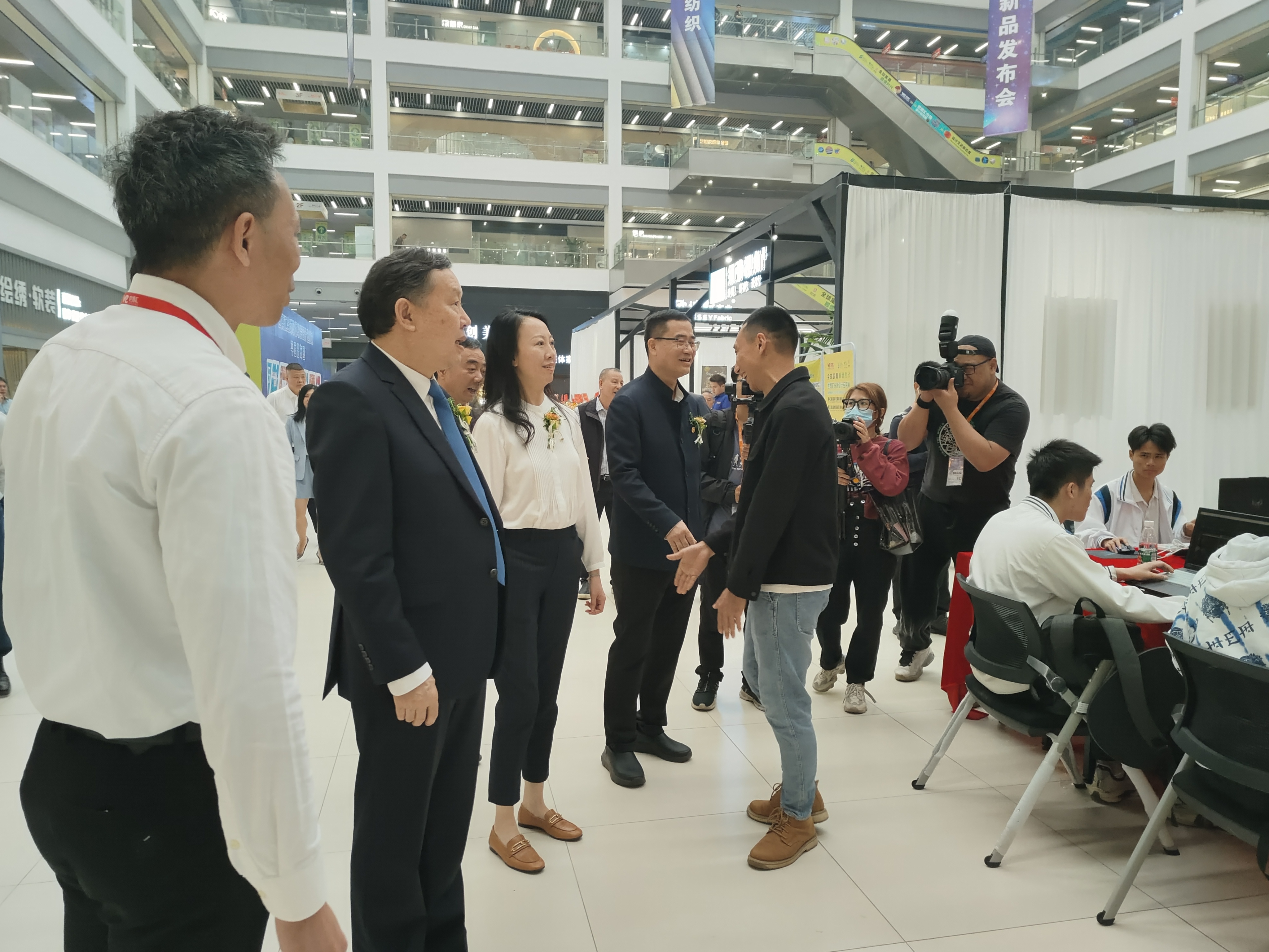 中国家具协会理事长徐祥楠、副理事长兼秘书长屠祺、广东省家具协会会长王克与执行会长张承志一行参观指导时,与我校家具专业骨干教师黄亮彬深切交流。学校开放的教学理念得到张会长的充分肯定。张会长鼓励我校师生坚持高质量产出,把优秀作品带入展会,实现产研学深度融合。