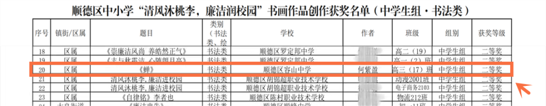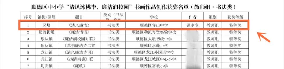 近日,顺德区教育局公布了“清风沐桃李,廉洁润校园”师生书画作品创作活动获奖名单,我校教师谭少宽的书法作品《清风廉洁》喜获特等奖。另外,学生何紫盈的书法作品《蝉》也获得了本次活动的二等奖。 获奖名单