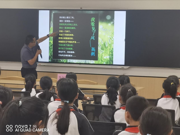 “秋天已经来了 夏天却舍不得走 微风脚步轻轻 好像牵着夏天的小手......”主持人以李老师写的童诗《夏天舍不得走》拉开了活动的帷幕。李老师以“秋天”为话题,以古诗《山行》和《赠刘景文》及诗歌《秋天的雨》为例,对其表现形式和写作手法进行了深入解析,引导学生仔细观察,大胆想象,通过看到的、想到的以及颜色、气味等方面进行“品秋诗”。李老师指出,诗歌的创作离不开联想和想象,在日常生活中要充分发挥想象的力量,拓宽写作的宽度与广度,鼓励学生们要多课外阅读,积累词汇,多进行原创诗歌写作训练,真情实感地记录生活。