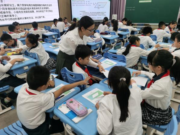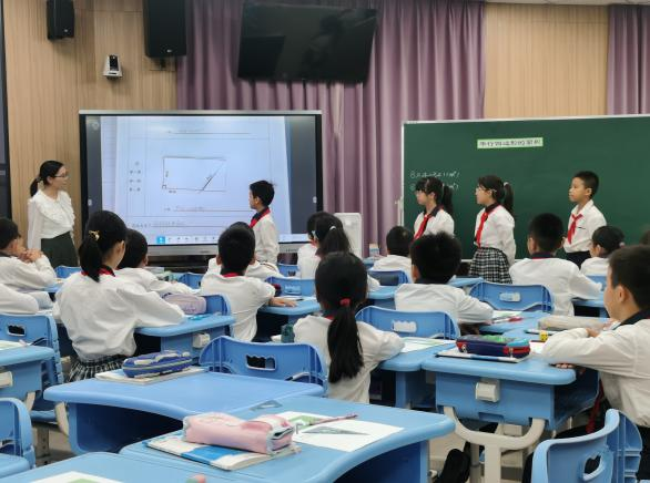 首先,由龙江城区中心小学程佩桦老师带来五年级上册《平行四边形的面积》一课。程老师结合可视化教学的理念,引入与应用可视化技术为学生构造学习环境,及时唤起学生的学习兴趣与动力,让他们易于完成知识建构与能力转化。本节课利用鱼骨图分析《平行四边形的面积》的三维目标,为开展可视化教学设计提供基础。“知识与技能”维度体现在可视化教学技术支持下,通过探究并推理出平行四边形的面积公式,能正确地应用公式计算平行四边形的面积。“过程与方法”维度体现在可视化理念支持下,通过动手操作、仔细观察、活动,自主探索平行四边形面积计算公式,渗透转化的数学思想方法。“情感态度与价值观”体现在培养学生动手探究、应用迁移、合作交流的能力。