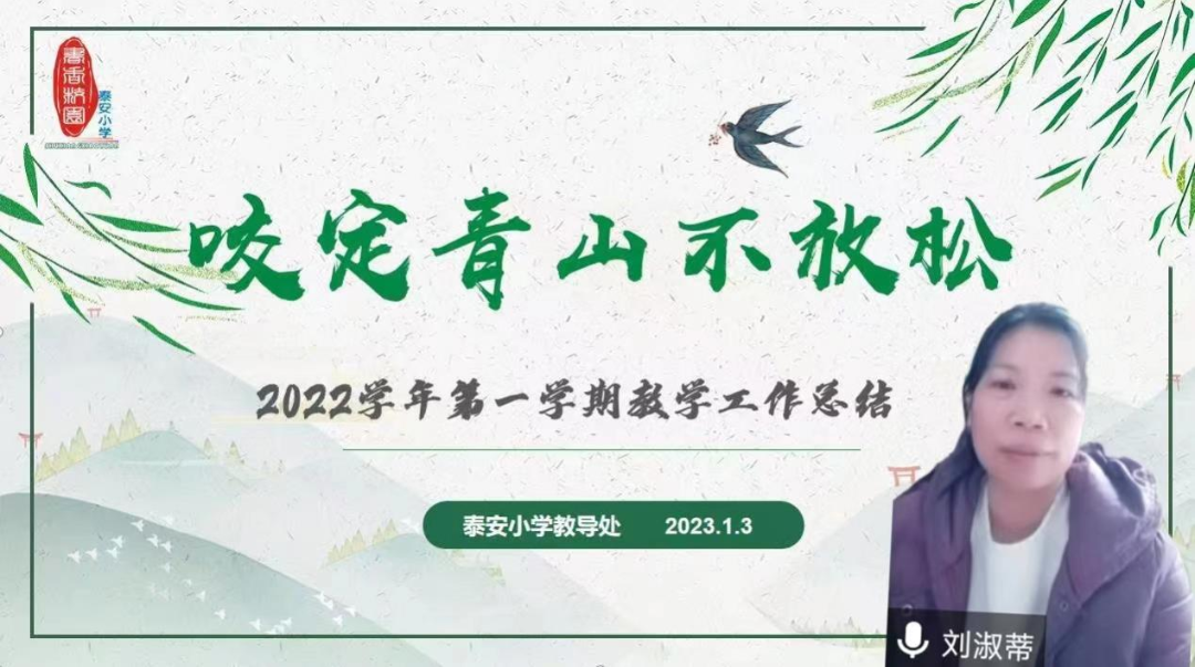 从金秋走到腊月,从寒冬跨过新春,过去的一学期在忙碌而充实的工作中悄然结束。2023年1月3日,泰安小学举行了2022学年第一学期教学工作总结线上会议。 总结会上,教务处何少森主任总结了本学期的教学工作开展情况,首先,何主任总结了本学期学校开展的重点工作,从开学初的科组长和级长会议的顺利开展,再到每年“翠竹杯”的顺利进行,也展示了这学期学校和老师们获得的可喜的成绩和进步,肯定了全体教师们的辛勤付出,鼓励老师们再接再厉、勇创佳绩。同时,也提出工作中星空体育有待提高的地方,要求老师们为个人专业发展和学生全面发展做到厚积薄发,多自省、多思考、多学习。 随后,各个科组长分别进行科组工作总结汇报。依次由高语科组长李小峰老师、低语科组长王萍老师、数学科组长刘淑蒂老师、英语科组长温桂花老师、综合科组长覃江桃老师进行科组工作总结,他们围绕教研工作开展、教师教学常规工作、教师专业发展、工作亮点和不足之处等进行全方面的工作总结,在简单而隆重的发言交流中提升科组建设。 回眸凝望,星空体育初心不变;展望未来,星空体育信心满满。带着咬定青山不放松的精神,泰安小学的老师们将继续坚守教育本心,带领学生乘风破浪。