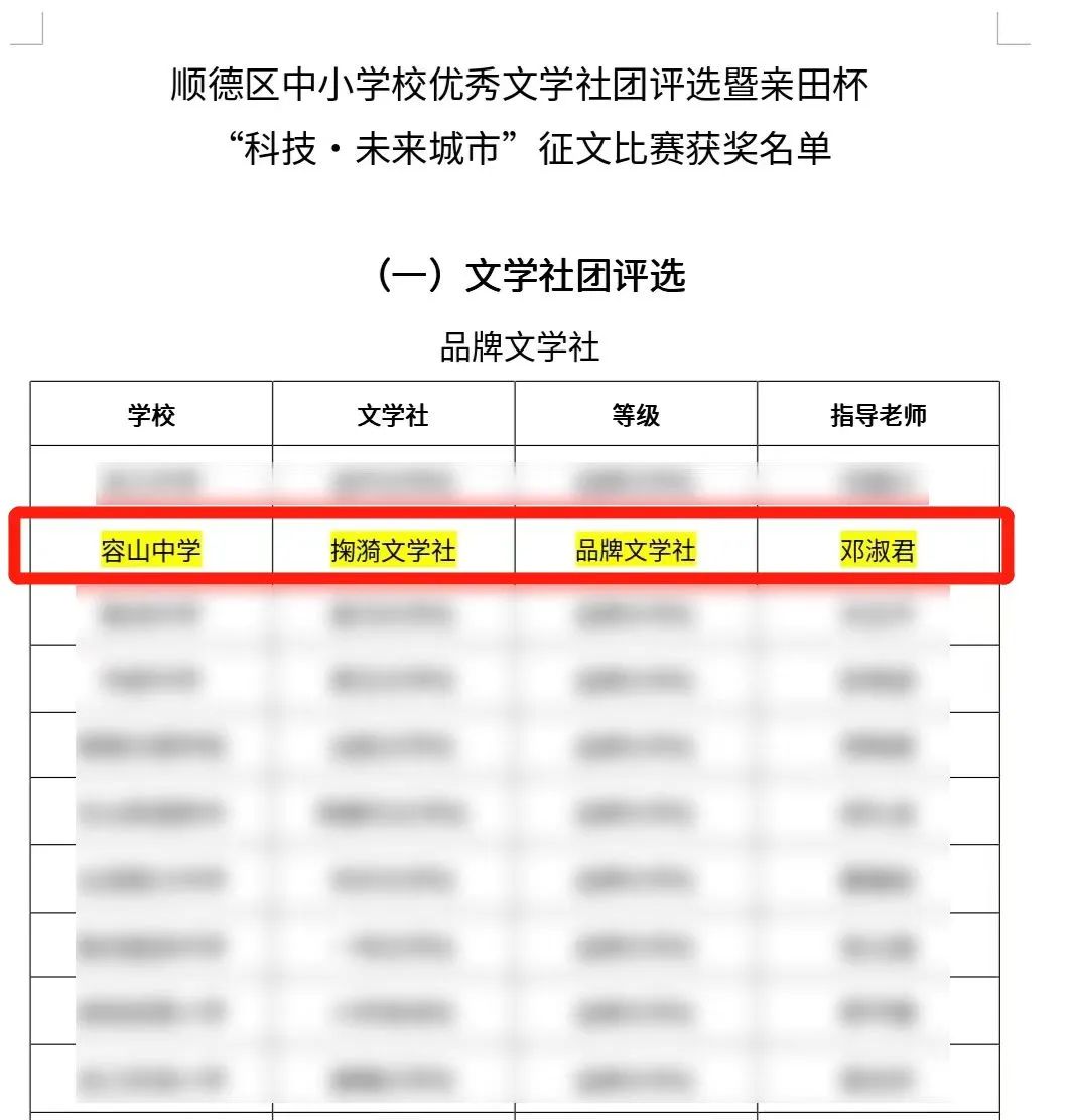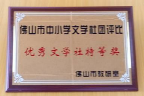 2022年11月顺德区中小学校优秀文学社团评选暨亲田杯“科技·未来城市”征文比赛活动中,我校由邓淑君、叶诗华老师指导的掬漪文学社以第二名的成绩被评为“顺德区品牌文学社团”,习礼根老师指导的林焕胜同学征文荣获二等奖。