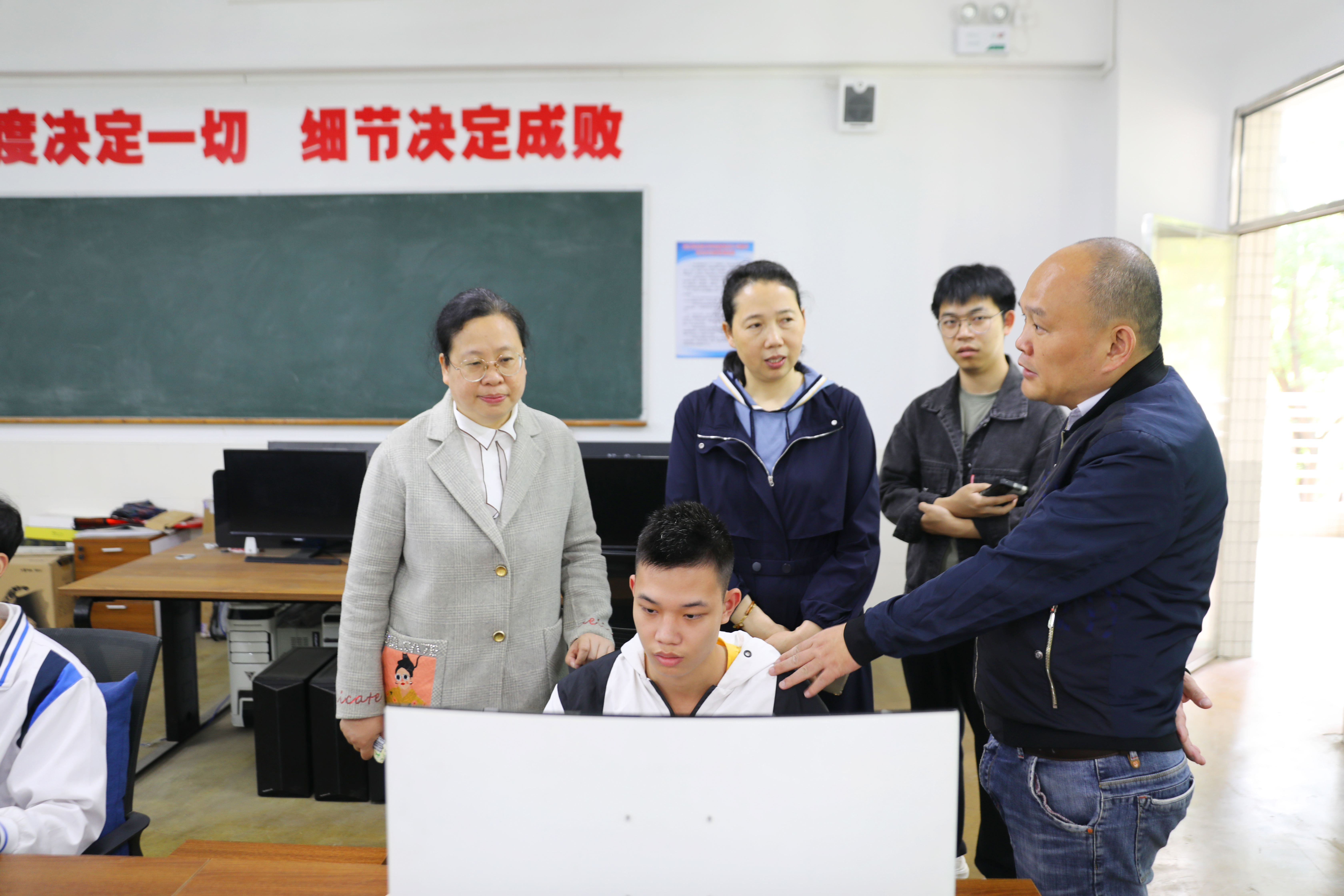调研团依次参观了佛山市杨伊纯名班主任工作室、3D打印创新中心、家具营销直播实训室、家具创意班、黄亮彬创新工作室、世界木工大赛实训室等。期间,衢州二职党委副书记、副校长王林玉不忘与我校教师讨论场室建设、学生实训等问题,坦言参观让他们受益匪浅,还饶有兴趣地驻足观看同学们的设计过程。