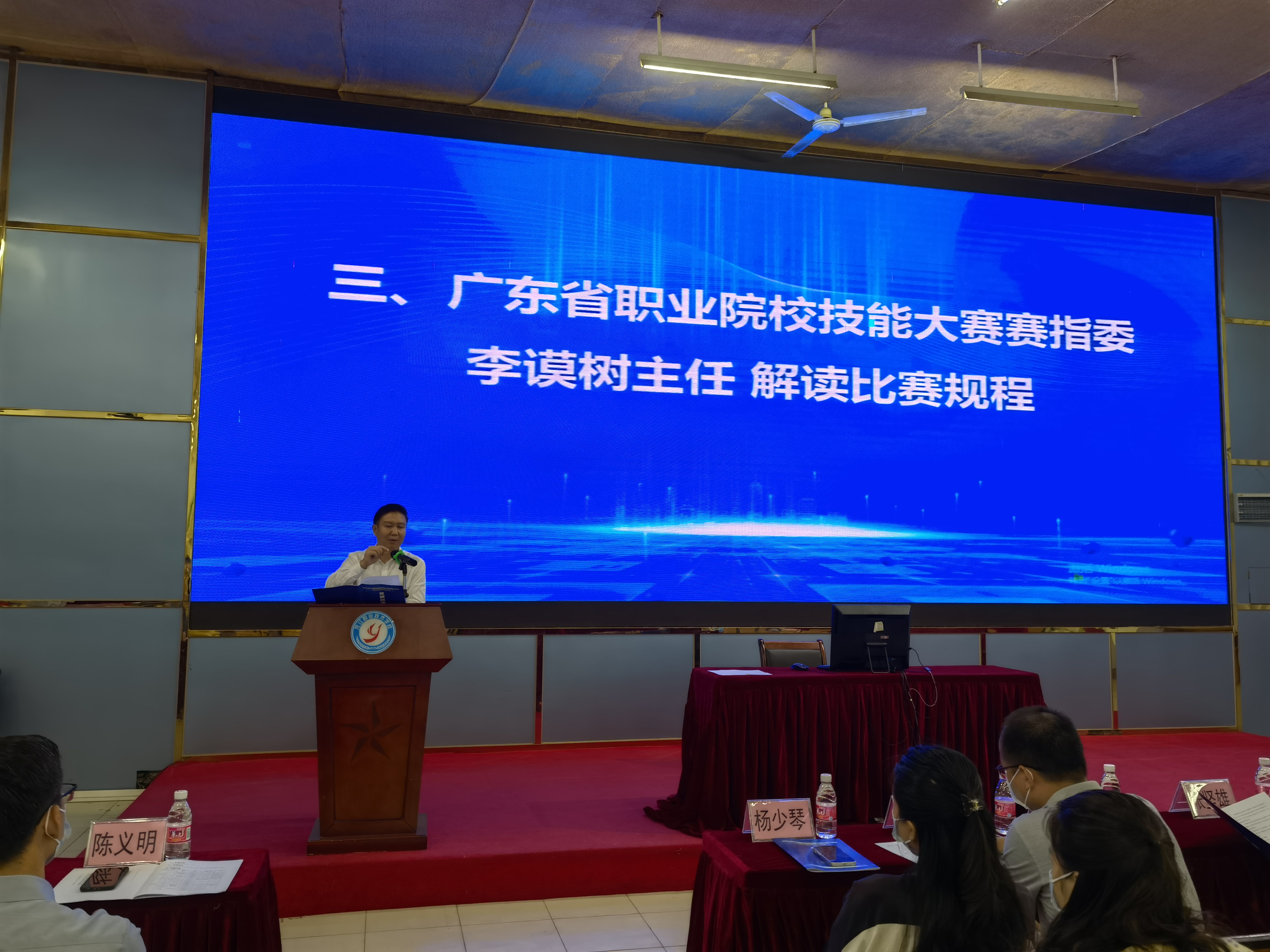 2022年8月26日下午召开了赛前说明会。广东省教育厅职业教育与终身教育处副处长张坚雄、广东省教育厅职业教育与终身教育处调研员郑佳、省赛指委主任李谟树、省赛指委秘书长廖中文、广东技术师范大学网络信息中心副主任陈志华、佛山市教育局教研室副主任王怀文、佛山市教育局教研员何爱华、佛山市顺德区教育局高教职教科科长杨少琴、佛山市顺德区龙江职业技术学校校长陈义明、佛山市顺德区龙江职业技术学校副校长杨慧、佛山市顺德区龙江职业技术学校教务处主任邱旭波,以及参加此次现场决赛的教学团队领队和教师代表,出席了赛前说明会。
