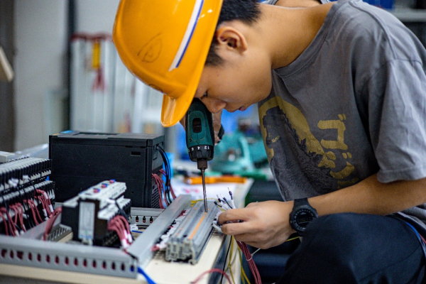 赛项国赛的比赛时长为7小时,是对选手体能、技能以及团队协作能力的多重考验。参赛队伍由两名选手组成,全面检验和考查选手通过电路设计、数字化虚拟场景搭建、硬件安装、PLC与触摸屏参数设置及调试等现代电气元器件知识的掌握程度和应用能力。