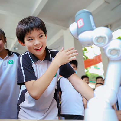 本次游园活动特邀了容桂青促会及其会员单位参与最新型编程机器人——可立宝机器人的展示。在周一的升旗仪式上,同学们已经观看了机器人的卖萌、跨越障碍和捡东西等精彩表演,很想近距离地一睹机器人的风采。在周五下午的游园体验活动中,青促会的操作导师们还带来了电视屏幕,同学们既可以通过视频观看到最新的科技发展成果,还可以亲自动手组装和控制机器人,并进行简单的互动。会打招呼的机器人,还有会出考题的机器人吸引了同学们的注意力——嵌入情感互动的机器人,就好像电影《超能陆战队》里面的大白一样,真的太有趣了!