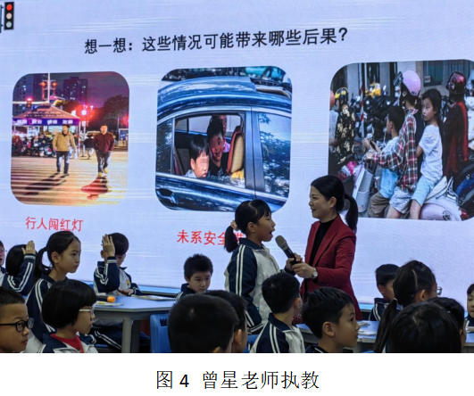 骆老师的课堂从学生熟悉的生活素材入手,拉近课堂与生活的距离,将安全的概念变化成具体可感的故事、音频和图片,从而让学生身临其境的去感受,去体验。例如在“平安出行”环节,骆老师就以十字路口、校门口和小河边这三个地点串联教学内容,让学生在具体的情境当中学会如何过马路、守交规和防溺水。骆老师把违反交规的现象和相应的交通法条去联系起来,让学生在具体的事例分析当中去理解和运用知识,从而真正做到理论联系实际,运用课堂学到的知识解决生活的问题。