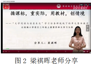 在各校代表分享汇报环节中,新圩小学罗婵老师、南涌小学何倩晴和李希洋老师、吴维泰纪念小学梁祺晖和和志芳老师、勒竹小学卢瑞云老师为大家分享各年级的单元整体教学设计的思路。其中吴维泰纪念小学梁祺晖老师以统编小学语文二年级上册第四单元为例分享“文学阅读与创意表达”学习任务群视域下的单元整体教学。梁老师根据课标、教材、学情以及学生生活情境设立大单元教学主题,再把语文要素、教材内容和教学主题进行有机融合,设计好任务群,让学生在亲身参与的语文实践过程中领会语文知识,获得运用语文知识的方法策略,提高语言的运用能力。