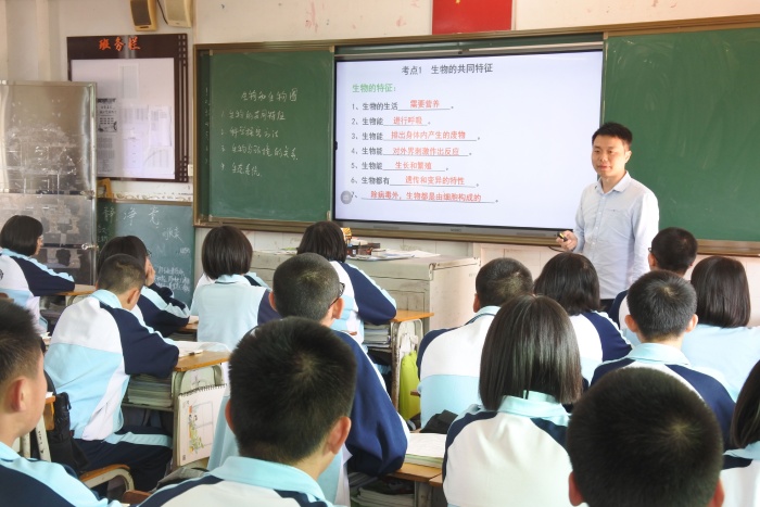 板芙初级中学青年教师潘霖向与会人员展示了一节复习研讨课《生物和生物圈》。他利用考点知识点的朗读作为导入,引领学生更好进入学习状态;继而为学生介绍本课近几年中考考查情况、强调重难点。针对考点,潘霖采用知识点回顾、练习、配以中考考题等教学策略,帮助学生建构知识框架,促进学生对一般概念的记忆理解。同时,鼓励学生上台讲解,开展小组交流,充分调动学生课堂参与热情。