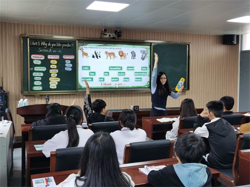 翌日,开展现场送课交流活动。板芙初级中学的3名骨干教师分别为汤溪学校的学子送上了3节展示课。英语骨干教师钟媚展示的是《Why do you like pandas?》。她通过创设动物园情景,将零散的教学活动统一在“设计动物园参观路线并说明原因”的大任务中,借助生动形象的图片、契合主题的动画和相关动物的声音,帮助学生学习动物名词和形容词,突破难词发音、名词单复和形容词感情色彩。整个教学过程,师生互动,很好地完成了教学目标。数学科组长向光荣老师带来一节八年级《平行四边形的判定》,她带领同学们在具体图形中落实判定的应用以及数学几何语言的表达,深入浅出,通过学生自主探究活动,充分地把课堂交给了学生,发挥了学生的主体作用。
