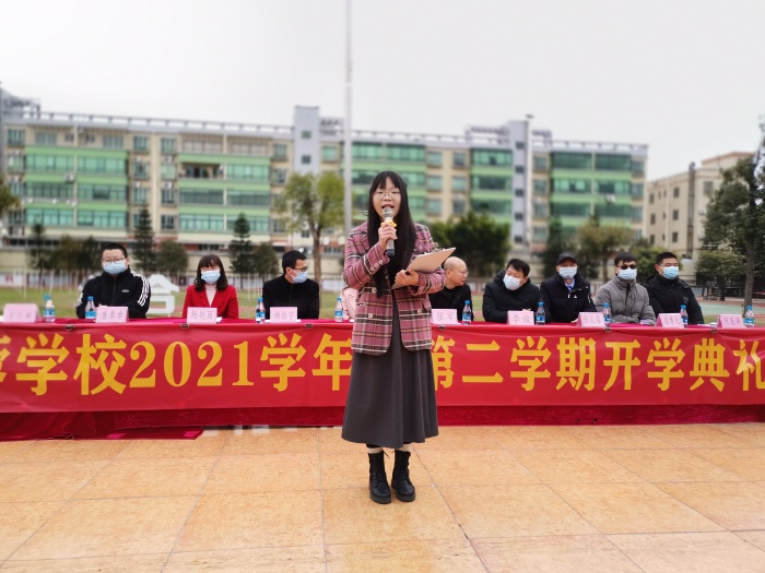 接着,优秀教师代表与九年级学生代表上台发言。师生代表言语间均充满了对新学期的期望和憧憬。党员教师廖月银老师表示,本着“对学生负责”的宗旨,将以敬业务实的精神开拓进取,与学生共同创造人生的奇迹。她向同学们提出,在学习中要带上理想和目标、自信和坚强、勤奋和努力。而学生代表发言则表达了九年级同学备战中考的决心和对中考的信心,对学校、老师的谢意,并在发言中代表全体同学郑重承诺:一定会珍惜学习中的分分秒秒,用最大的热情和努力迎接新学期新生活。