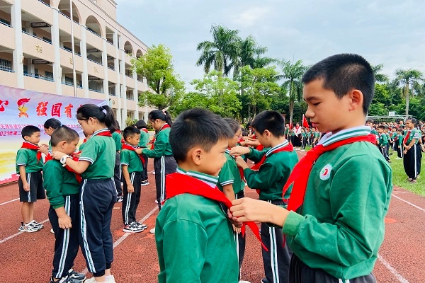 由大队长宣布新队员名单后,二年级新入队队员们昂首挺胸站立,高年级哥哥姐姐为二年级学生佩戴红领巾。鲜艳的红领巾在队员胸前飘扬,队员们神采奕奕,激动不已。