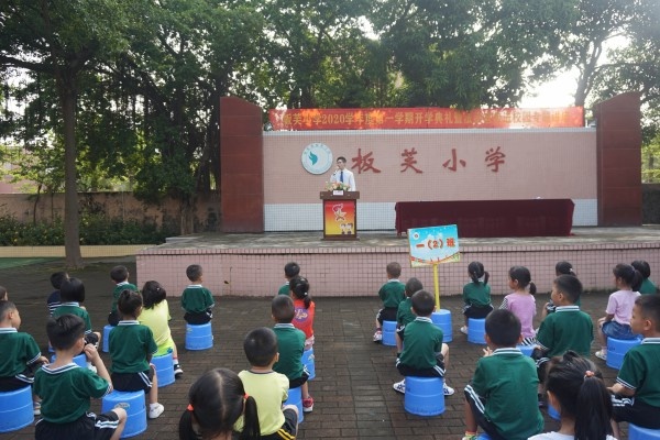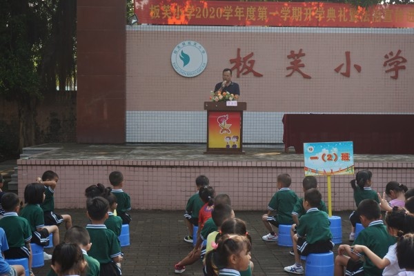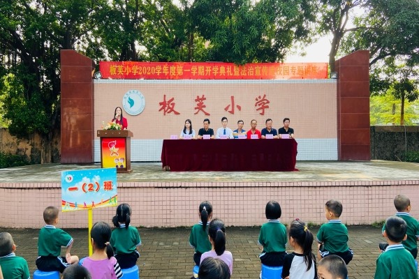9月3日上午,板芙小学全体师生在小广场举行2020学年第一学期的开学典礼暨法制宣传进校园专题讲座。会议由梁茵主任主持,镇关工委梁炳轩副主任、黄北胜老师出席了本次活动。
