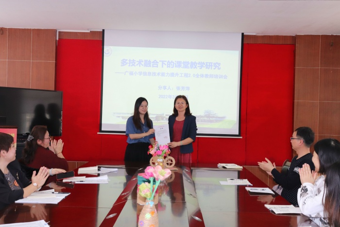 3月14日下午,广福小学邀请该校信息技术骨干张芳萍老师为老师们做信息技术应用能力提升工程2.0项目培训,张老师以《多技术融合下的课堂教学研究》为题,从基本的操作步骤、科组研修任务、教师如何选择合适的能力点,以及视频制作等方面进行详细介绍,为全校教师在实现学科教学与现代信息技术深度融合方面指出了清晰的方向。校长苏雪霞充分肯定了张老师的培训,要求全体老师要细加领会消化,不断提升课堂高效教学。