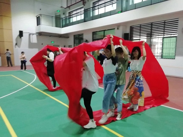 在工会主席和体育教师的精心策划下,老师们以科组为单位组队参加比赛,各科组精心挑选参赛教师参赛。本次教师趣味运动会比赛项目在内容和形式跟往年比都有创新,除了接力运网球外,还增加了火龙滚动轮。两个比赛项目都强调了团队的合作性和一致性,同时也突出了趣味性和娱乐性。赛场上,老师们都全力投入,团结协作,你追我赶,使出浑身解数,志在必得,力争第一。旁边的老师加油声、呐喊声不断,场上充满了老师们的欢声笑语,其乐融融。