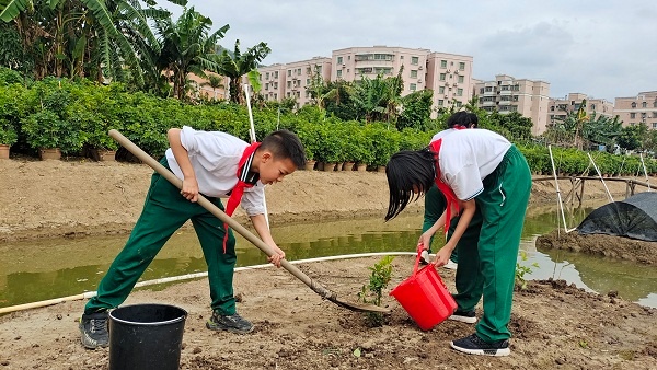 在找到预定位置、明确任务后,大家便一鼓作气投入到植树活动中。在这一过程中,同学们不怕累、不怕脏,搬苗、种树、培土、浇水一气呵成。大家兴致勃勃地干着,在两个多小时的欢声笑语中,家长义工和同学们便高效完成了植树任务。想象着小树苗在阳光下茁壮成长,同学们无比欢喜!活动结束时,孩子们红彤彤的脸上带着笑意,回头看看那片虽然还不太高大挺拔的青绿,言语间充满着对小树苗茁壮成长的期待,脚上沾满的泥土是同学们爱绿护绿的最好证明。