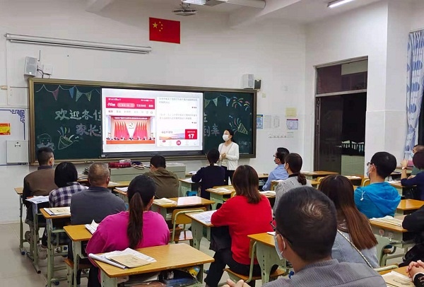 各班家长会上,班主任和家长们一起学习了家庭教育、安全教育、“学习强国”平台、“双减”政策等内容。在“学习强国”交流分享环节,老师和家长代表分享了自己的学习经验,有的精心准备了课件讲解,有的开展答题比赛,有的现场指导,看视频、听新闻、学理论,让“学习强国”更接地气、更有活力、更有温度,深入人心。