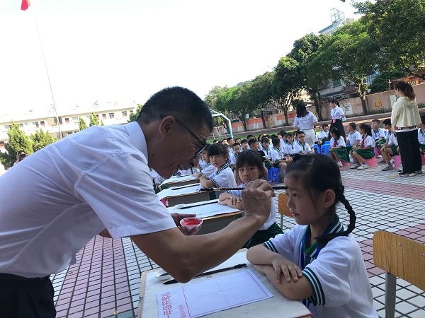 开笔礼第一环节是正衣冠,孩子们在低段语文科组长蔡老师的带领下正衣冠,这是孩子们知书明理的第一步;随后,在李杰华的带领下,老师们为孩子们朱砂启智,在他们的额头中间点上朱砂印,祝福他们从此眼亮心明,启迪智慧。第三环节由体育老师击鼓明智,在三声鼓声中,孩子们跟随谢老师明礼。第四环节由书法老师启蒙描红,李老师手握毛笔,饱蘸浓墨,在挂起的宣纸上教学生们一撇一捺写下一个“人”字,寓意在人生的启蒙阶段学会做人是最为重要的。每班学生代表也在纸上认认真真地书写“人”字并展示;最后一个环节是鞠躬敬师,全体老师上台接受学生三鞠躬,接着向孔子画像行“三拜礼”,表达尊敬敬师之情。