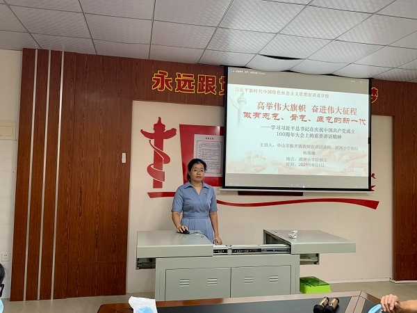 8月17日上午,湖洲小学教师会议室里正在举行湖小党支部八月份主题党日活动(学习贯彻习近平七一讲话精神专题宣讲活动),活动由党支部书记李杰华主持,全体支部成员参加了本次活动。