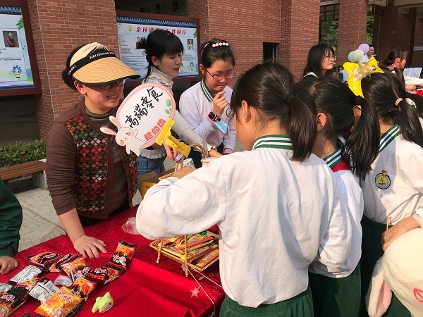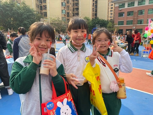本次爱心义卖活动以各班为单位,率先义卖“沉沉”“灵灵”文创周边产品,印有“沉沉”“灵灵”图案的笔记本、钥匙扣、铅笔、橡皮、尺子等深受学生喜爱。孩子们来到户外义卖现场,琳琅满目、别具一格的义卖新品,让人眼前一亮;卖力吆喝的“售货员”,成功向师生们售出义卖品;精彩绝伦的乐队表演吸粉无数,现场掌声不断。