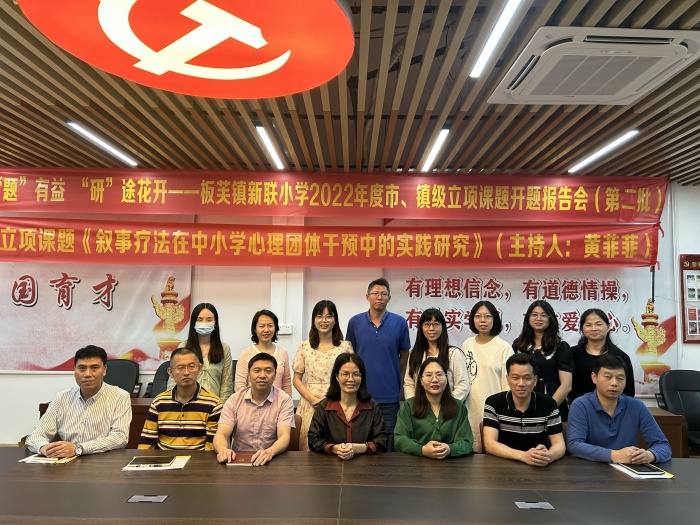 科研赋能,从“心”出发。为扎实推进新联小学心理健康教育工作,切实提升教师教育科研水平,加强课题研究与教育教学活动的有机结合,促进心育工作成效再上新台阶,4月6日,新联小学组织开展了2022年度镇级立项课题《叙事疗法在中小学心理团体干预中的实践研究》开题报告会暨邹丽琼名师工作室活动。本次开题报告会邀请了中山市教育研究室、心理健康正高级教师梁剑玲莅临指导,板芙镇教育和体育事务中心张运生、孙军辉和胡新国三位教研员,新联小学校长吴肇葵、新联小学行政代表及课题组成员出席了本次活动。