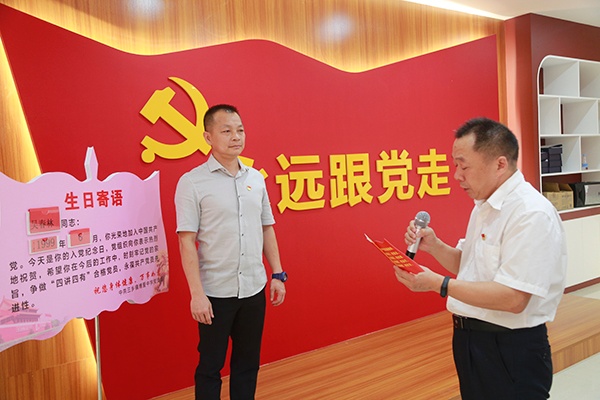 8名6月份入党的党员在发表感言时表示自己不忘初心,会在教育工作中继续踏实认真、积极进取,时刻牢记自己身为一名党员的责任使命,并努力在平凡的岗位中做出成绩回报党恩。