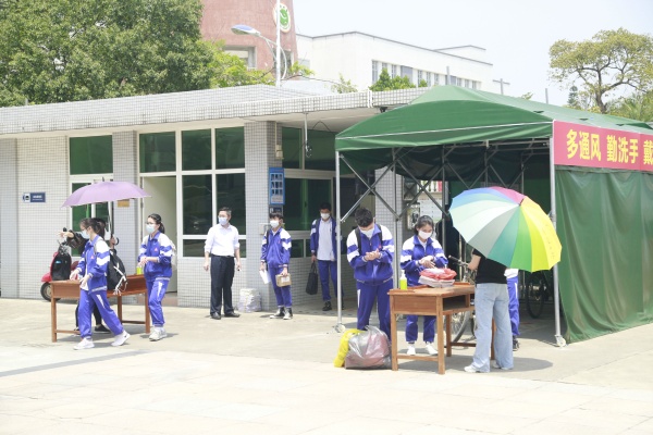 根据上级指引,博爱中学初三学生从中午12:20开始,实行分五批次错峰返校。中午12:20,值日教师组织学生在校门口排队,保持1米的间隔距离,依次有序进入体温检测通道。在测温区,值日教师在通道两侧通过红外测温仪和手持测温仪对学生逐个进行体温检测,体温正常的学生使用免洗洗手液清洁手部后进入校园。学生进校后按照指定路线回到相应班级。由班主任再次测量体温,方可进入课室。