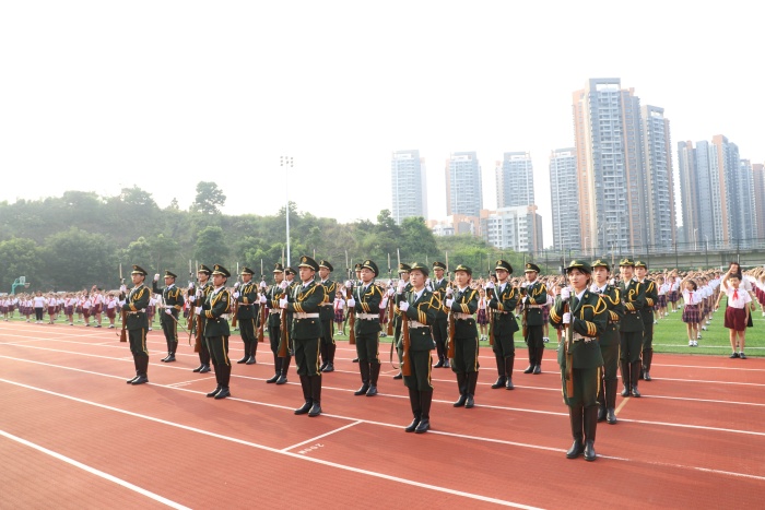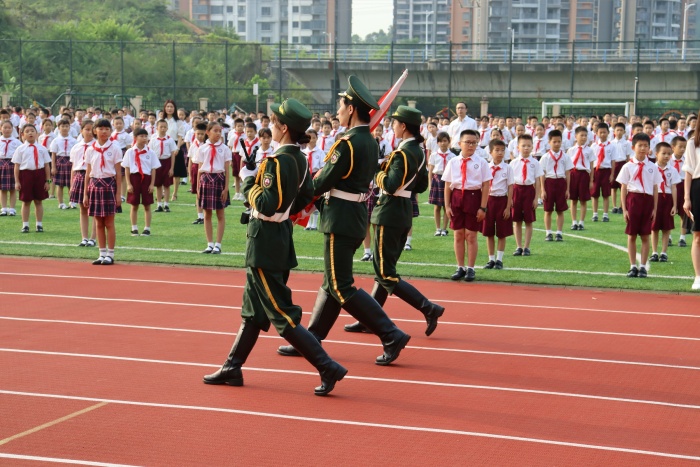此次的升旗仪式,邀请了火炬职院国旗护卫队的老师和同学们出席。只见国旗护卫队英姿飒爽,迈着矫健的步伐,迎着朝阳,在雄壮的国歌声中,将鲜艳的五星红旗徐徐升起。博凯小学全体师生齐唱国歌,祝福祖国的第72个生日,祝愿国家越来越繁荣昌盛。