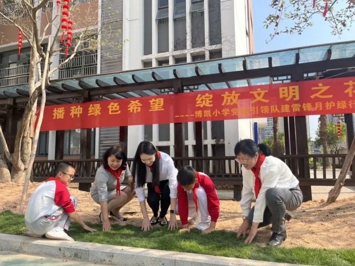 习近平爷爷说:“一树新栽益四邻。”和煦的春风里,校园的行道树悄然冒出点点嫩芽,枝头上的鸟儿奏起了欢歌。为学习贯彻习近平总书记重要指示精神,进一步传承和弘扬雷锋精神,3月10日下午,博凯小学党员教师带领学校少先队开展以“播种绿色希望,绽放文明之花”为主题的爱绿护绿学雷锋志愿活动。