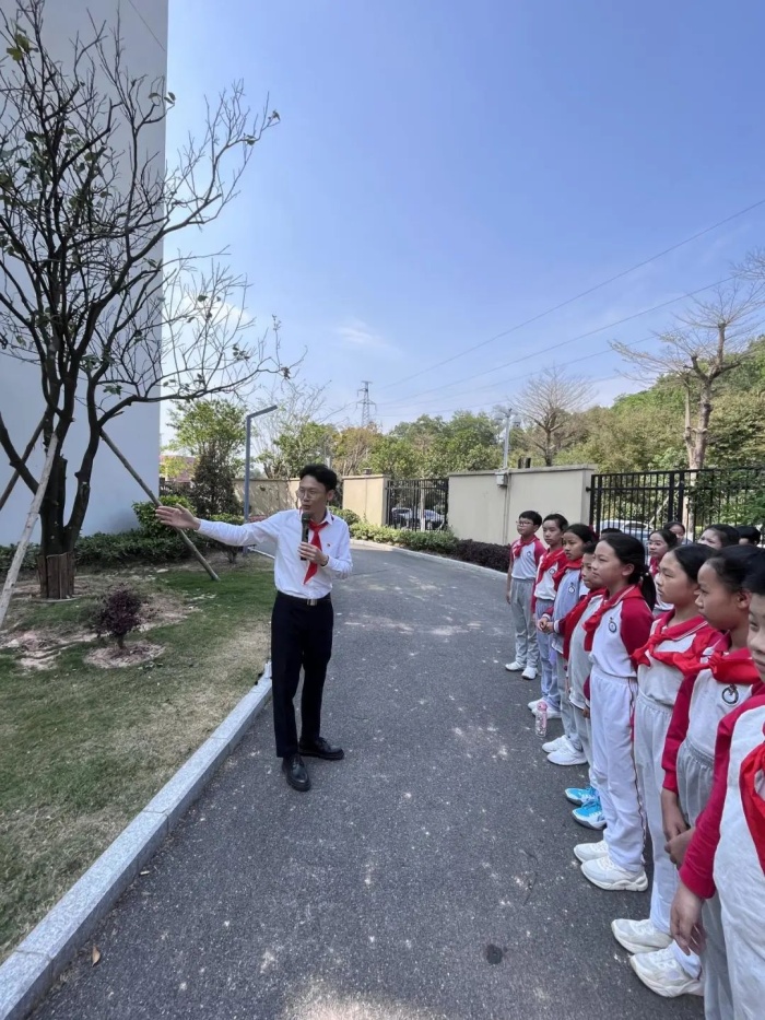 坐落于青山畔的博凯小学,远可观山景,近可赏校“绿”。今年,最美的博凯校园又添新绿。七彩年轮池旁的几棵树便是年初新种下的,破寒抱春,它们已在阳春中悄然发芽。和煦的阳光下,胡冬梅校长、谢少声副校长、李春雨副校长、钟惠晶主任和大队辅导员罗嘉立老师上台为勃勃生机的树木剪彩,愿它们与博凯学子一道茁壮成长。随后,博凯金牌小导游带领大家一起观赏校园树木,在他们详尽的介绍中,大家纷纷感叹原来校园里的树木有这么多种类,每棵树木都有它自己的“身份证”。