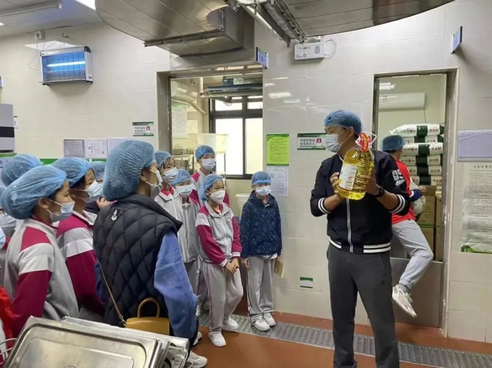 提案答疑环节结束后,黄锭君主任带领各中队少先队员代表走访了食堂,详细观察和了解了学校食堂的材料及制餐过程。