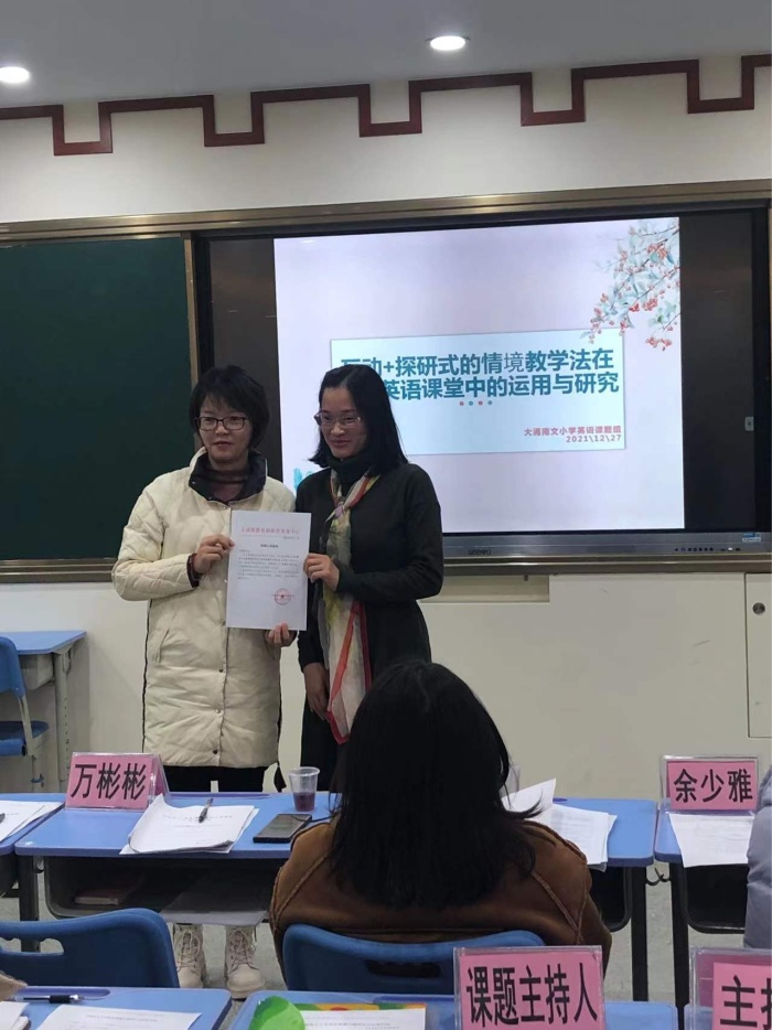 最后,大涌岚田小学万彬彬主任为课题负责人颁发立项证书,为本次两个课题的开题报告会画下圆满的句号。相信在各位专家的指导下,在学校领导的关心帮助下,全体课题组成员一定会克服困难,在课题研究中收获硕果。