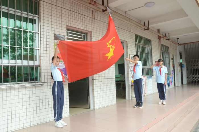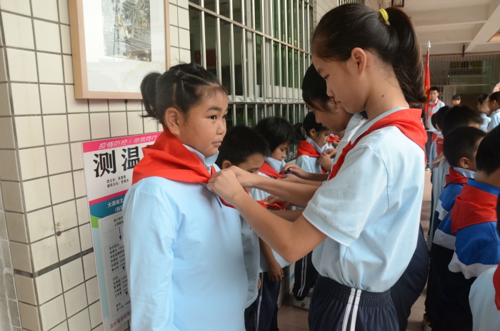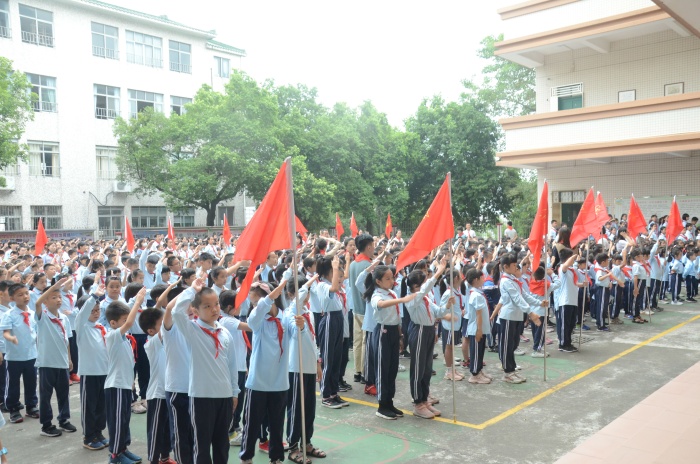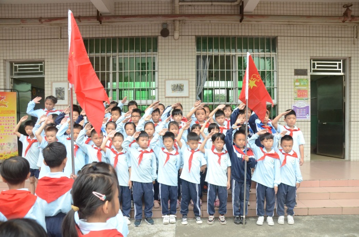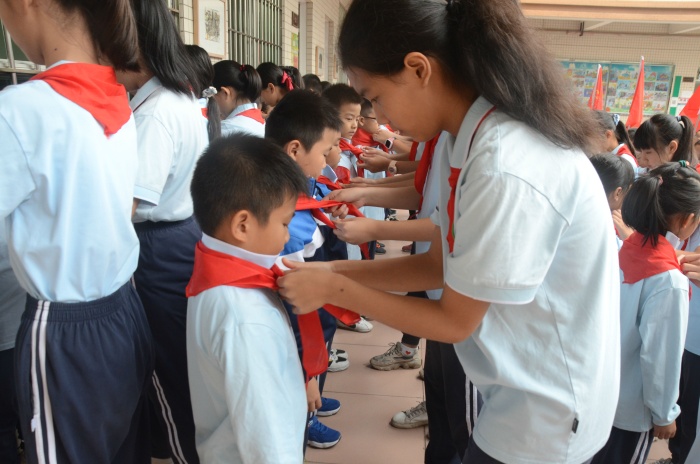 入队仪式随着《中国少年先锋队队歌》的歌声正式拉开序幕,少先队辅导员王利勇老师宣布了入队决定。通过分批入队,本次又有130名新队员光荣的加入了少先队组织,这是他们光荣和幸福的时刻!决定宣布之后,六年级优秀少先队员代表为新少先队队员佩戴了鲜艳的红领巾,此刻在鲜艳的队旗下,全体少先队员们的庄严宣誓响彻大涌南文小学校园的上空。在大队辅导员的带领下,少先队员们大声呼号:“时刻准备着”,表明为共产主义事业贡献力量的决心。