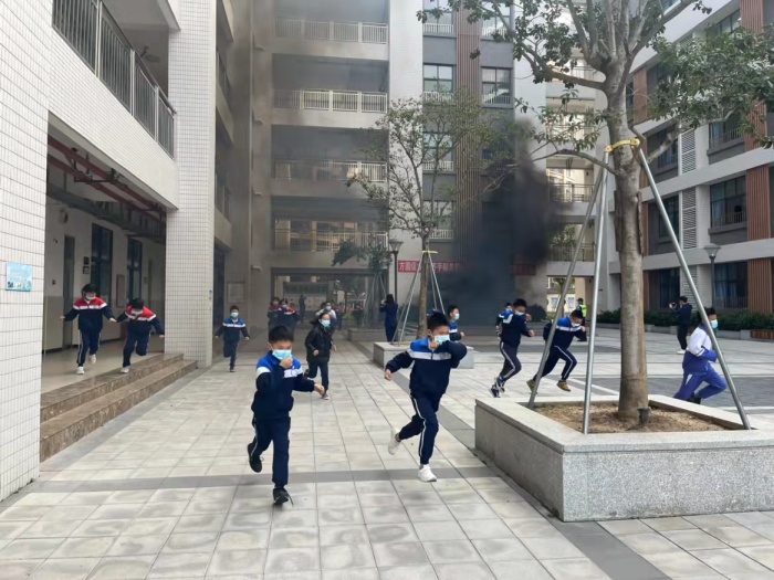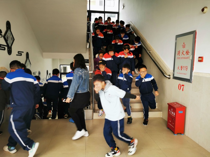 演练开始,火警的警报声响彻校园。各班班主任带领学生捂住口鼻,弯腰撤离;各楼层指导教师协助安抚稳定学生情绪,指导帮助学生做出正确逃生姿势,沿着学校就近楼梯口逃生,有序地到达操场安全地带;随即体育委员开始清点人数并上报至现场年级组长,确保全部学生安全到达。