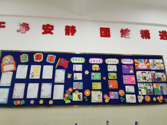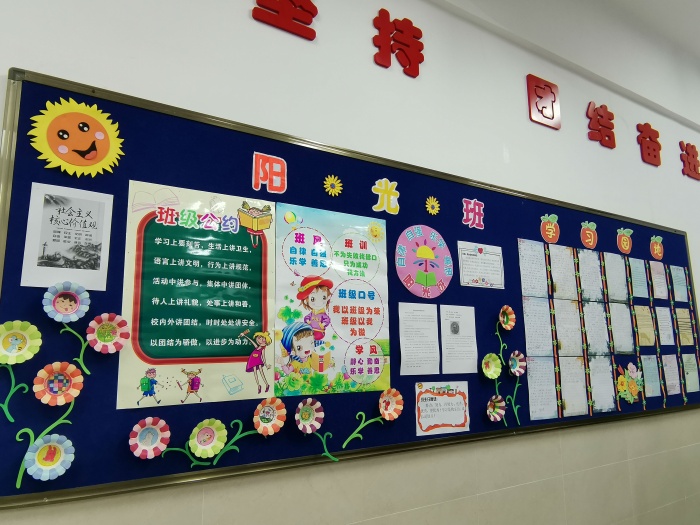 从设计精美的黑板报、各具特色的文化墙到散发着浓浓书香的读书角,再到墙上的优美文章和字画,无不彰显师生的智慧和创意。教室内张贴的社会主义核心价值观、中小学生守则,与各班级独具匠心设计的班队徽、班队口号、队员风采展相得益彰。还有各班制定的班级公约,让同学们学会从点滴约束自己的行为,养成良好行为习惯。