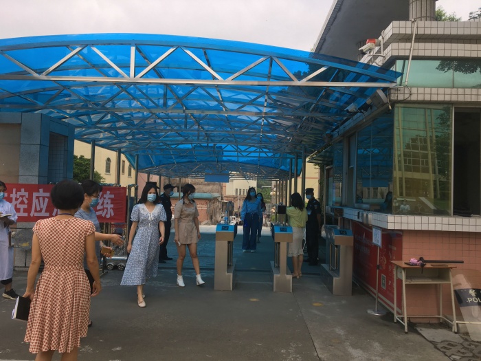 场景二设置在课室。课室是学生上课的主要密集场所,在课室按要求配备体温探测器、消毒液等防控物资。课室演练内容设定为学生在课室上课期间,出现发烧情况。在课室演练上课期间,学生举手报告自己不舒服。按照防疫流程询问,老师及时给学生测量体温,把学生带到临时观察区。同时,老师通过疏散通道立即把班上其他同学带到备用课室,进行体温检测。在隔离观察室,班主任老师对学生进一步检查、询问近14天有无疫区旅居史、接触史等,再联系家长将学生带离学校,由家长带到就近就医,同时,班主任第一时间上报学校防疫工作小组领导,并做好登记。学校防疫工作小组通知学校后勤人员对体温检测异常人员所在班级进行全面消毒,清洁人员30分钟后用清水擦干净。