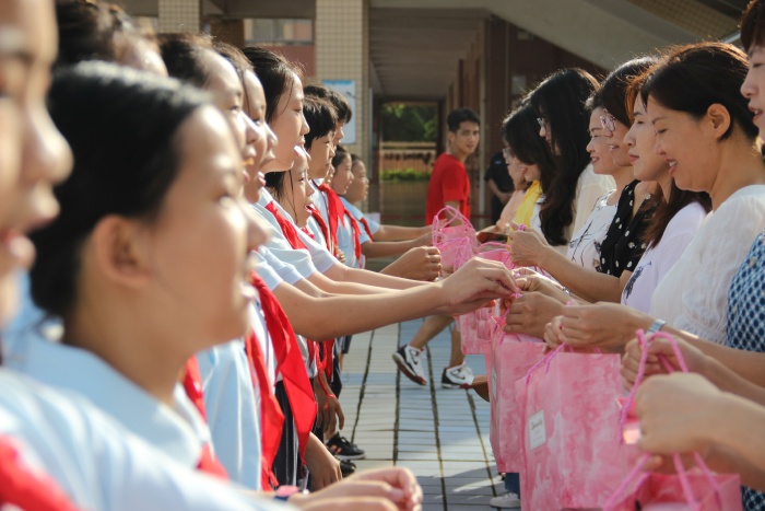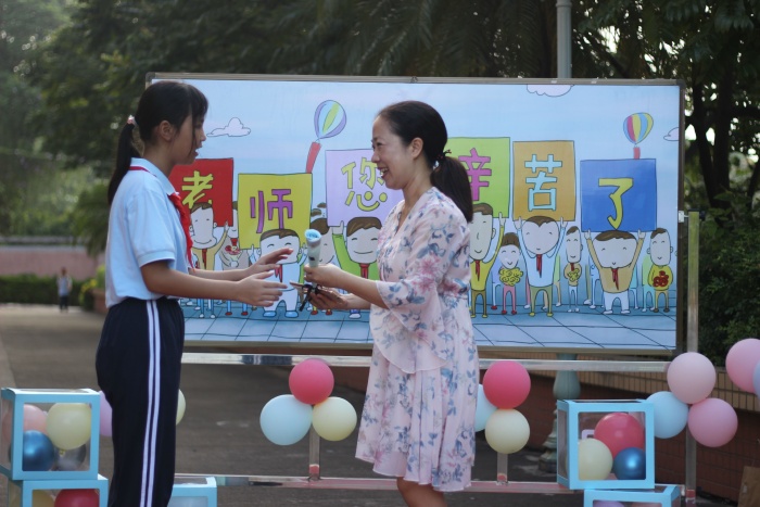 在操场上,旗北小学两位学生为全体教师送出深情的诗朗诵,赞美广大教师的一路辛勤耕耘,静能春风化雨润物无声,动能点石成金琢璞成器。随后,在这幸福、温馨的时刻,少先队监督岗队员代表旗北学子,为教师们送上节日的礼物和祝福。一声声“老师,您辛苦了”的感恩之语在旗北校园传递,在旗北教师心间回暖。