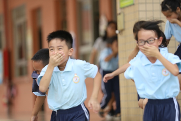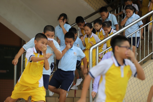 演练开始前,少先队辅导员林嘉诚老师对全校师生进行了安全教育,指出在疏散演练中要注意安全事项和和逃生的方法。随着警报声响起,全校950多名学生在各班老师的指引下,弓着腰,用手、袖口、湿毛巾等捂着嘴鼻迅速有序地进行应急疏散,全体师生快而有序地撤离到校园安全地带。从警报声响起到最后一名学生撤离到广场,用时3分多。学生安全撤离到广场后,各班迅速清点人数,确保每一名学生都已安全撤离,并及时将清点结果汇报给演练总指挥李文科老师。