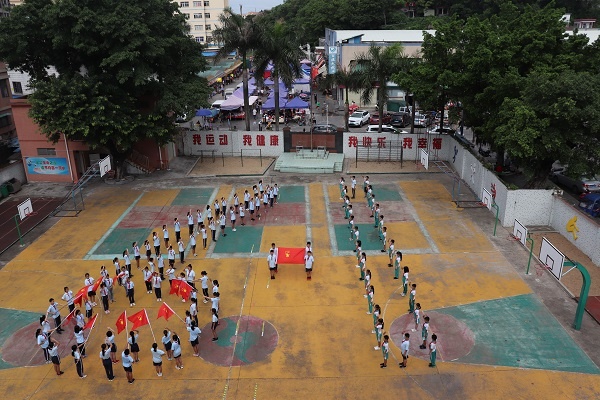 升旗仪式结束,旗南小学的孩子们齐聚操场,高举队旗,摆出“六.一”的图形,队员们自己用特别的方式和行动来欢庆六一。表达了队员们从小坚决传承红色基因、筑牢精神支柱、坚定理想信念,听党话,跟党走。