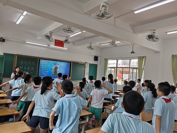 全校各个班级在第四节课开展“童心向党,快乐成长,歌唱六一”唱歌活动,全体队员敬礼,面向班级国旗唱《国歌》,再唱《中国少年先锋队队歌》、《劳动最光荣》、《快乐的节日》。还有其它自由选择曲目。各班在正副班主任的带领下有序地开展活动,孩子们都兴致勃勃地参与其中,宁静的校园瞬间沸腾起来。队员们在教室激情高昂地唱着《国歌》、《中国少年先锋队队歌》……这是一个充满欢歌笑语的乐园,全体队员们用歌唱、舞蹈表达自己心中的喜悦之情。每一个孩子的脸上都挂着一个小太阳,每一间教室都沉浸在欢乐的海洋。
